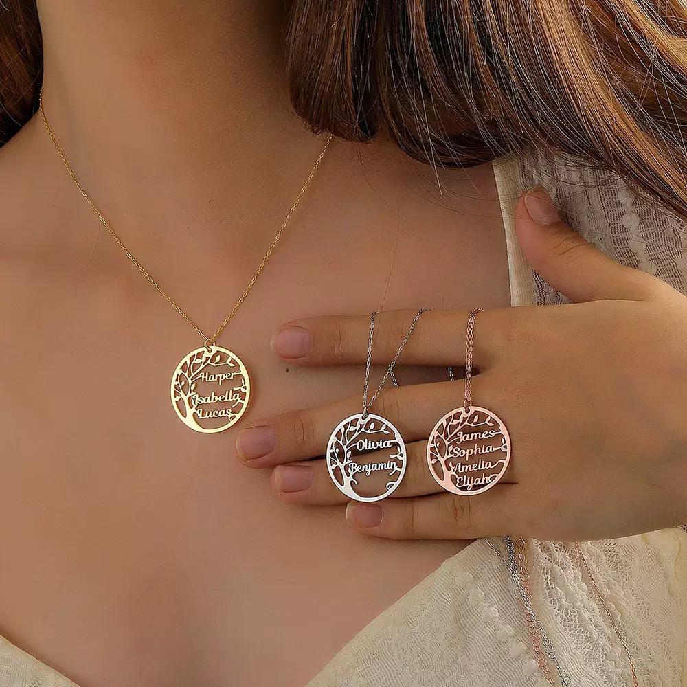 Vous pouvez personnaliser votre arbre avec 1 à 4 prénoms selon le modèle choisi. Nos clientes avec familles nombreuses adorent voir tous leurs petits-enfants représentés sur leur collier !